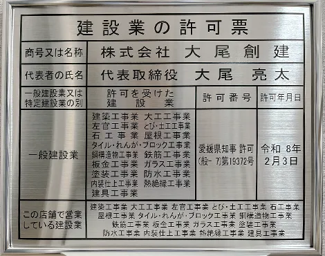 一般建設業許可 愛媛県知事許可 第019372号 建築工事業 大工工事業 左官工事業 とび・土工工事業 石工事業 屋根工事業 タイル・れんが・ブロック工事業 鋼構造物工事業 鉄筋工事業 板金工事業 ガラス工事業 塗装工事業 防水工事業 内装仕上工事業 熱絶縁工事業 建具工事業 |